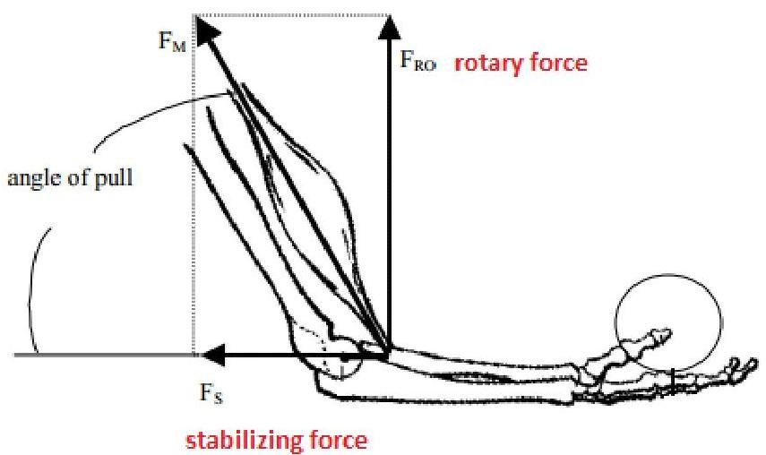 Muscle force produces a torque around the center of rotation of the joint on which it is acting. The muscle force can be broken into components to determine its actual effect on the joint