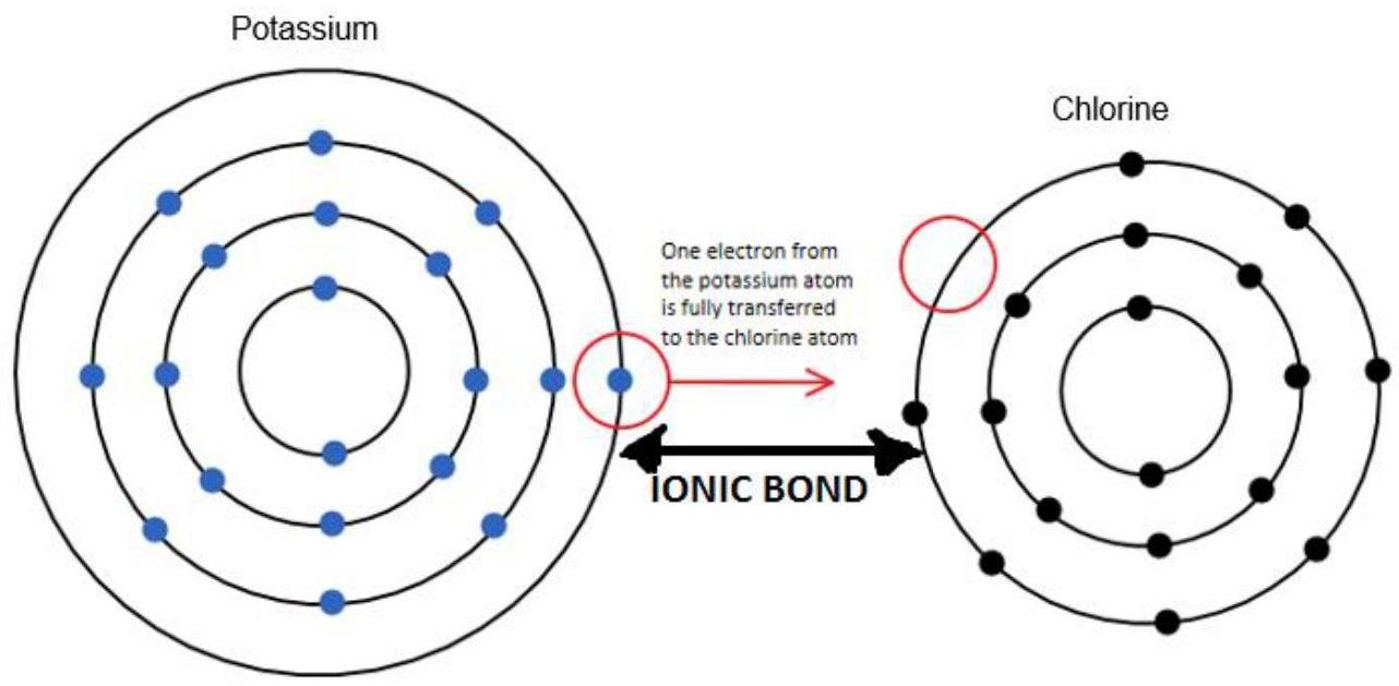 Ionic bond is formed between potassium ion and chlorine. It is a result of static attraction between positive charged ion (potassium) and negative charged ion (chlorine).