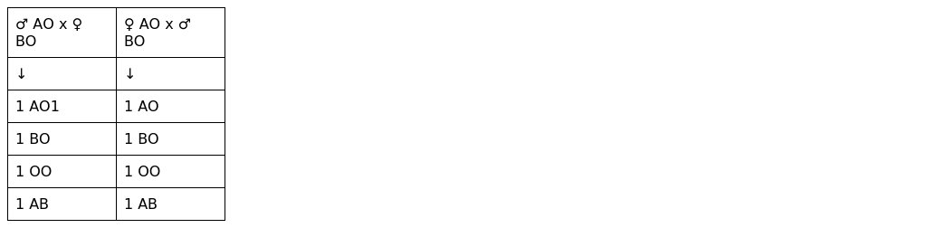 Homozygotic son (OO) could be born in families B and D with the probability (probability to get allele O from both parents is , thus probability of the zygote (genotype and phenotype in the case of co-dominance) is a product of the probabilities of both gametes (). As these traits are not sex-linked it does not matter which parent has A or B allele. Thus, both cases are equiprobable.