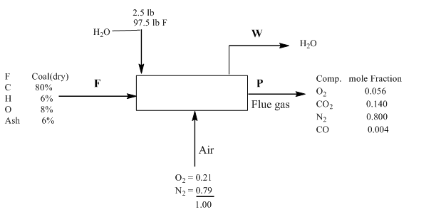 Since the coal contained the 2.5 %moisture and the basis is 100lbmol , the water or moisture entering the system can be calculated as follows:
