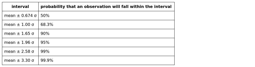 The statistical theory calculates that for a large number of observations, 50% of the observations will fall within 0.675 σ of the mean and 68.3% will be within σ of the mean. Some other probabilities are given below. Applying these probabilities to the set above (recognizing that this set does not qualify as a large number of observations), 50% of the observations are expected to fall in the interval 109.1 ± (0.674)(4.3) = 106 to 112; 68% in the interval 109.1 ± 4.3 = 105 to 113; and 90% in the interval 109.1 ± (1.65)(4.3) = 102 to 116. These statistics are seen to apply to this set of observations.