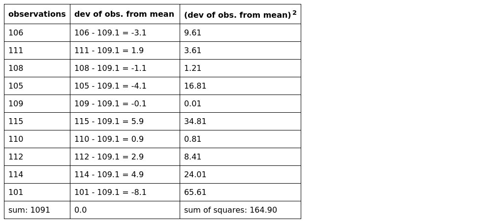 The average of the ten values above is 109.1. When 109.1 is subtracted from each of the ten values, and the differences are squared, the sum of the squared deviations is 164.9. If we change the target value to 109.0 or 109.2, and repeat the process, the sum of the squared deviations is 165.0. Changing the target value to 108.9 or 109.3 produces 165.3 for the sum of the squares of the deviations. On this basis, 109 is a better representation of the observations than is the mid-range value of 108.