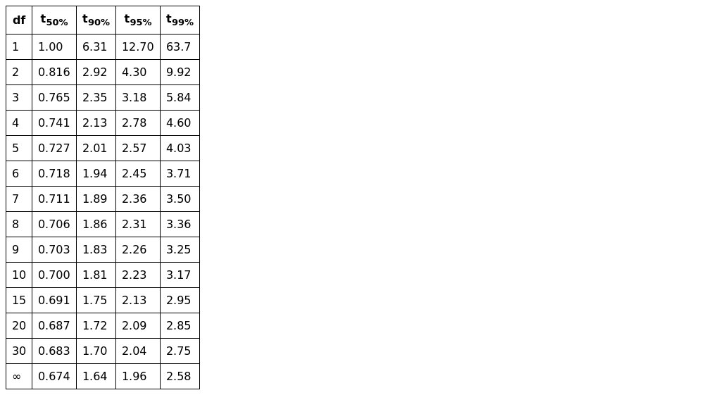 t-factors for Various Levels of Confidence: