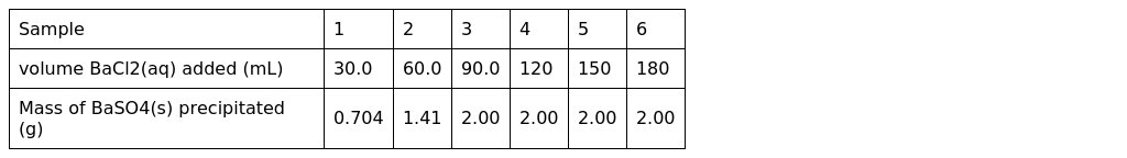 Assume you have a powder of MgSO4 contaminated with some other substance that does not react with Barium or Chloride. The percentage purity of powdered, impure magnesium sulfate, MgSO4, can be determined by gravimetric analysis. of the impure magnesium sulfate is dissolved in water and the solution is made up to in a volumetric flask. Different volumes of BaCl2(aq) are added to six separate samples of this solution. This precipitates the sulfate ions as barium sulfate. The precipitate from each sample is filtered, rinsed with de-ionised water and then dried to constant mass.