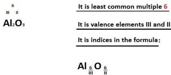 I find least common multiple numbers 3 and 2(3 and 2 is valence Al and O). It equals 6. I will divide 6 by 3 and I will get 2. It is index near Aluminum. I will divide 6 by 2 and I will get 3. It is index near Oxygen. So, .