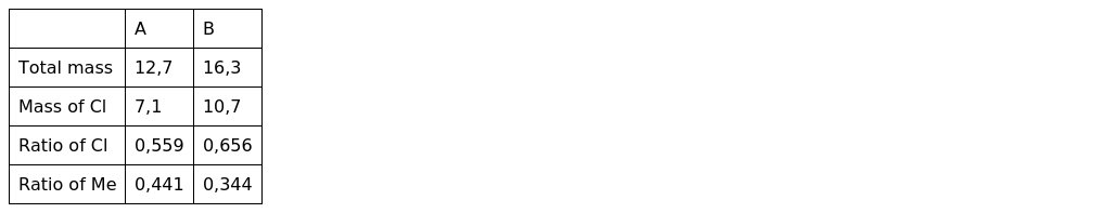 Ratio of Me : Ratio of Cl = 0,441:0,559 = 1: 1,267