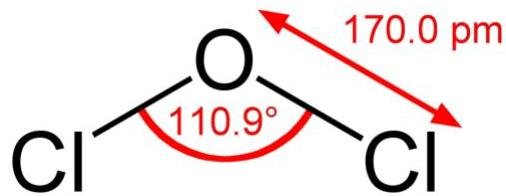 The structure of dichlorine monoxide is similar to that of water and hypochlorous acid, with the molecule adopting a bent molecular geometry due to the lone pairs on the oxygen. The bond angle is slightly larger than normal, likely due to steric repulsion between the bulky chlorine atoms. In the solid state, it crystallises in the tetrahedral space group I41/amd, making it isostructural to the high pressure form of water*