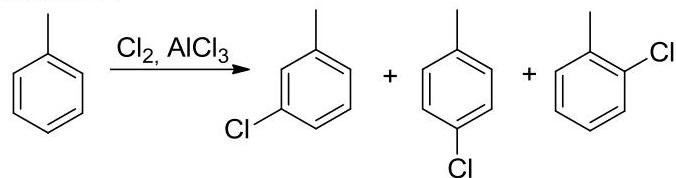 If you bubble chlorine through methylbenzene in the dark in the presence of aluminium trichloride catalyst, the ring is chlorinated giving a completely different product. In fact a mixture of three compounds.