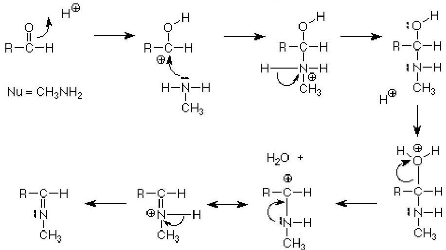 v) Reaction of primary amine, in presence of an acid, with carbonyl compound given an imine. The rate of reaction increases by an increase in acidity but beyond a certain limit, the rate decreases with further increase of acidity.