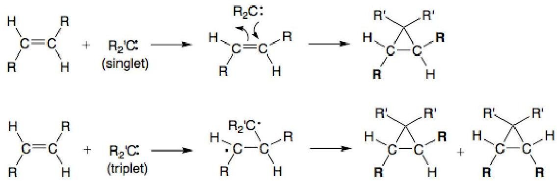 formed. Singlet carbene reacts in one step and configuration of products depends on configuration of alkene.