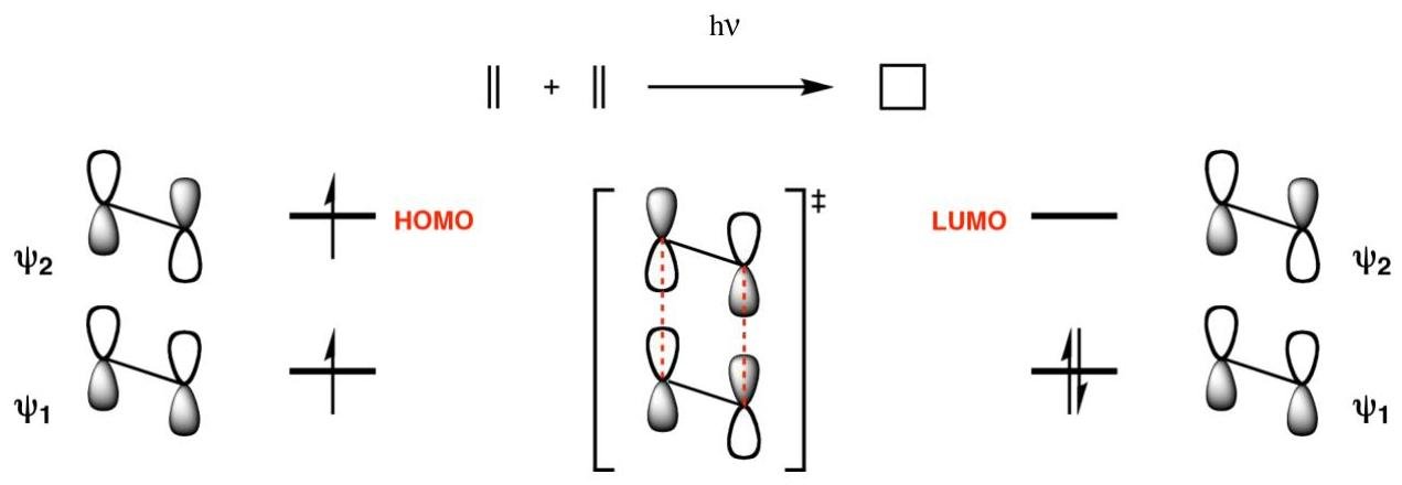 Thermally, the [2 + 2] cycloaddition is geometrically forbidden, as the HOMO and LUMO of the participating olefins would not be able to achieve the orbital overlap required for σ-bond formation.