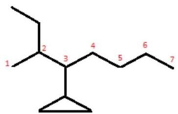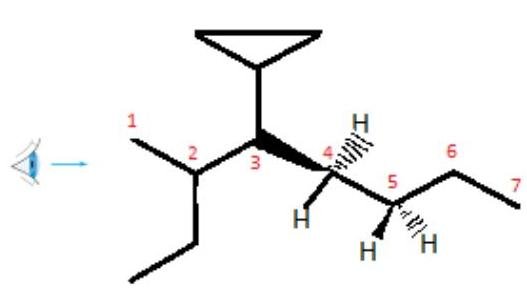 (a). Consider the molecule 2-ethyl-3-cyclopropylheptane. Sighting along the C4–C5 bond, answer the following questions. (i). Draw the Newman projection of a gauche conformation; (2)