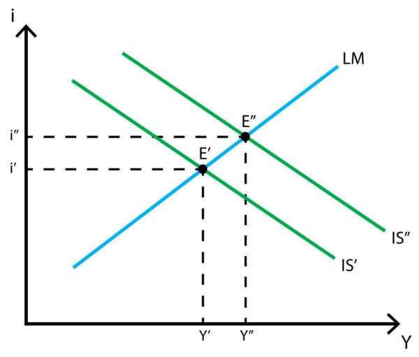 This is a state when IS curve and LM curve are equal.At this point the real interest rate is determined.However, change in government spending increases productivity at any interest rate. This causes a shift in the IS curve and therefore equilibrium shifts consequently the real interest rate and level of production Y changes as shown below.