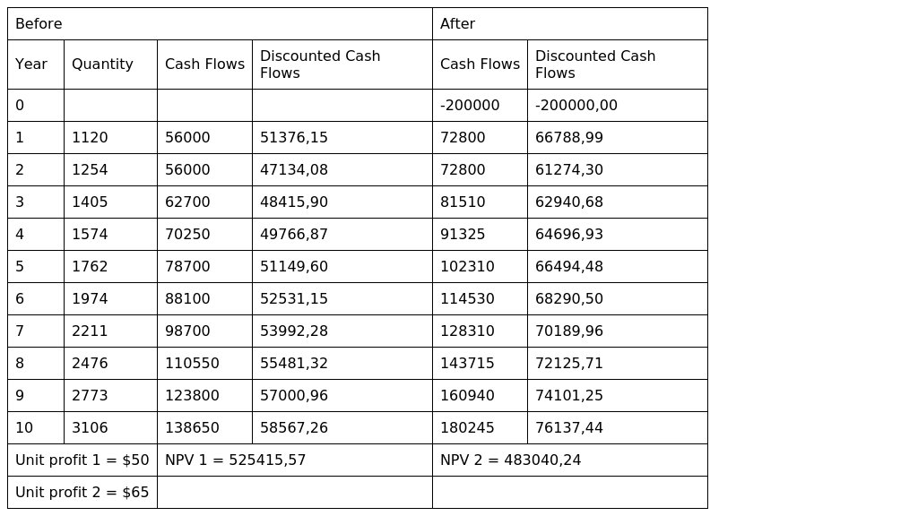 As we can see from the table with calculation, the NPV of the project is 483,040 dollars, so the project will be profitable and the company will get money back in 10 years. But 10 years is not enough to get such high profits as with the old technology.