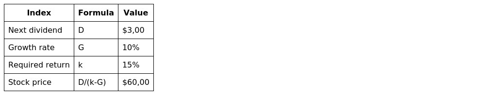 An investor is considering the purchase of a share of a company. The stock will pay a dividend a year from today. This dividend is expected to grow at 10% per year for the unforeseeable future. The investor thinks that the required return on the value of this stock is 15%. Given this assessment calculate the value of a share of the company's stock.