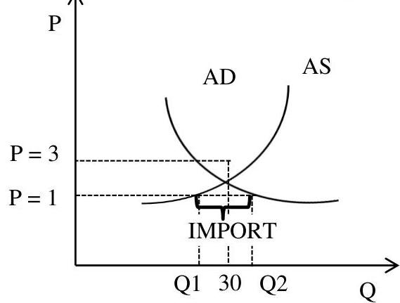 Suppose that the price per unit is of a cellphone on the world market is 1 USD. Consider the following economy where the domestic supply of cellphones is given by , the demand for cellphones is where is the domestic price. How many cellphones does the whole country produce and consume in autarky and at what price?