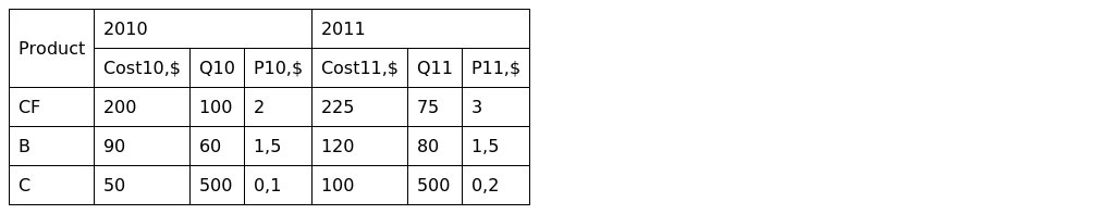 CPI(2011) = (Q10cf*P11cf + Q10b*P11b + Q10c*P11c) / (Q10cf*P10cf + Q10b*P10b + Q10c*P10c)