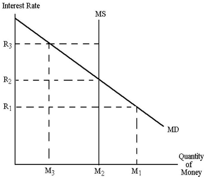 B. The rate of interest is determined by supply of money and demand for money in an economy. The equilibrium rate of interest is determined at the point where money supply equates the demand for money in the money market as shown in the diagram below.