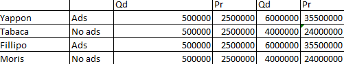 3. There are 1,000,000 smokers, each buying 1 pack of smokes a week, and only 2 tobacco firms, Fillipo Morisso & Yappon Tabaca. Each firm can produce any amount at flat cost $4 per pack, and each firm sells at a price $10 per pack. Each firm can run an advertisement campaign that costs $500,000 per week. If none runs a campaign, each firm gets 500,000 buyers. If both run a campaign, each firm gets 500,000 buyers. If one firm advertises and the other one doesn’t, the advertising one gets 600,000 buyers and the one who does not advertise gets 400,000 (i.e., 100,000 buyers switch from one firm to another because of the ads but nobody quits or starts smoking due to the ads). Put everything together: costs of production, cost of advertising, and sales for every possible combination of strategies.