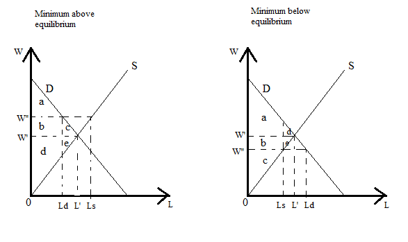 2)minimum wage is below equilibrium. In that case the demand of labour force exceedes the supply and quantity employed will decrease(Ls<L'). Such policy will effect welfare of consumers(employers) and suppliers(workers).