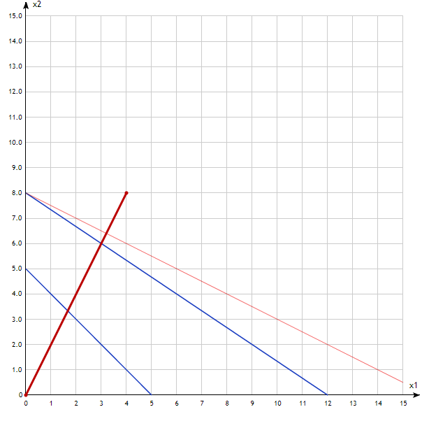 The red thick line shows the gradient of the objective function, the red thin line shows the level line so that the indicated region remains in the region in which the values of the objective function are accepted that are smaller than this.