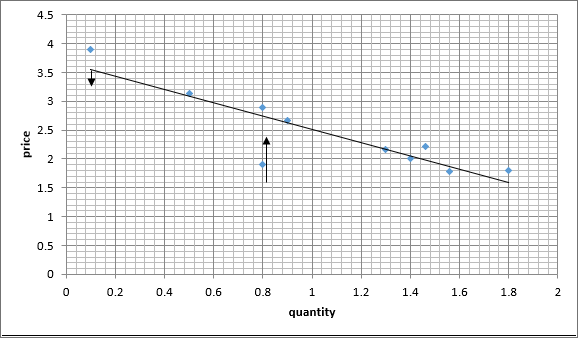 From the illustration, one would realize that the line of best fit does not take into consideration some of the plotted points but cuts through selected pints with majority of the points. The extreme points of within the graph as marked by the arrows give a higher deviation and if not properly represented, the relationship between the product prices and the quantity demanded will not presents the accurate picture of the intended description. A higher standard error of the estimate would mean poor representation of the statistical information and if the gradient of the line is used as the regression coefficient, the values predicted become exaggerated. The analysis of the demand is therefore flawed and non-representative.