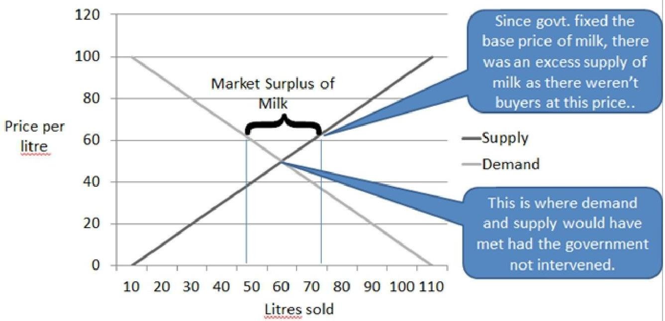 As both milk and meat are produced by cows, the dairy to farmers for slaughtering cows will increase the supply of meat, that's why the surplus of meat will also appear, after which the price for meat will decrease.