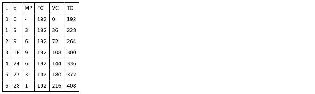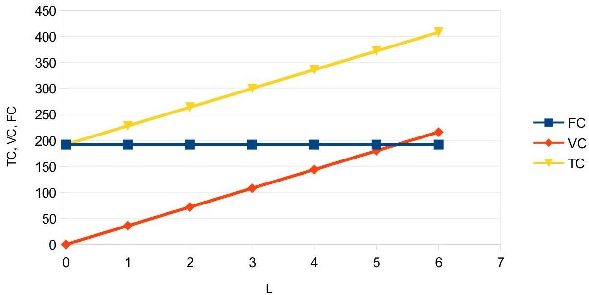 (b) VC=$36∗L,TC=FC+VC\mathrm{VC} = \$ 36^{*}\mathrm{L},\mathrm{TC} = \mathrm{FC} + \mathrm{VC}VC=$36∗L,TC=FC+VC