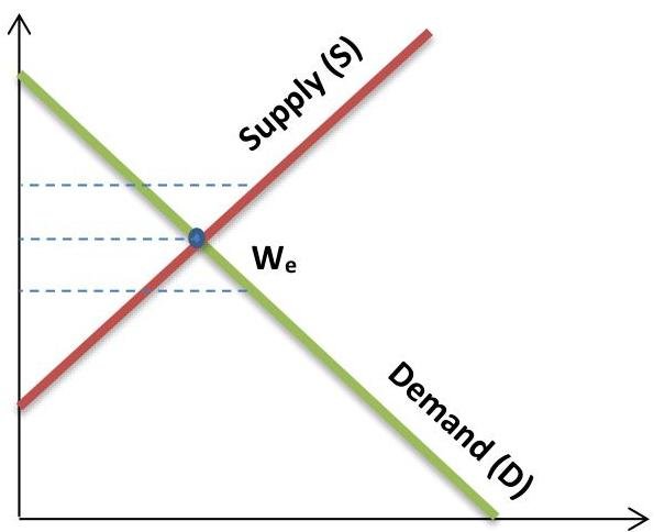 If the wage is free to adjust in response to market forces it will move to We, where the demand for labour equals the supply. When the wage is above We, more labour will be presented for employment than firms in the industry can profitably hire. It will pay workers to lower their wages to obtain employment in the industry. And when the wage is below We, firms will find it profitable to hire more labour than is presenting itself for employment. They will offer a higher wage to obtain additional workers.