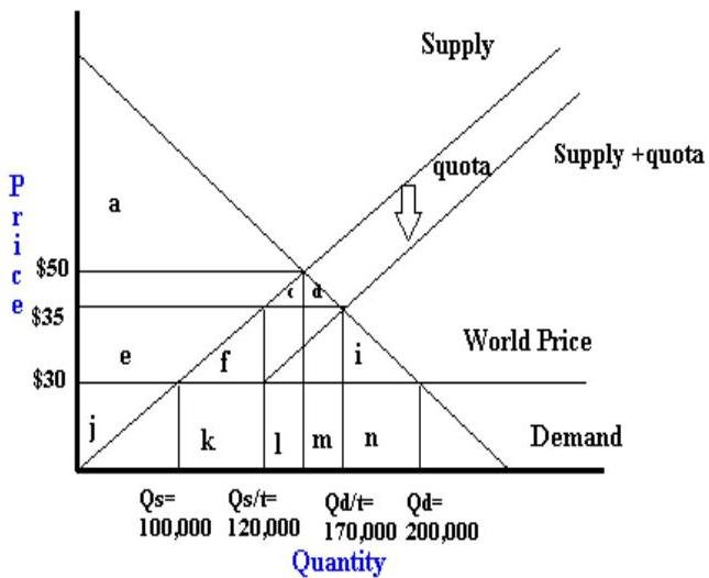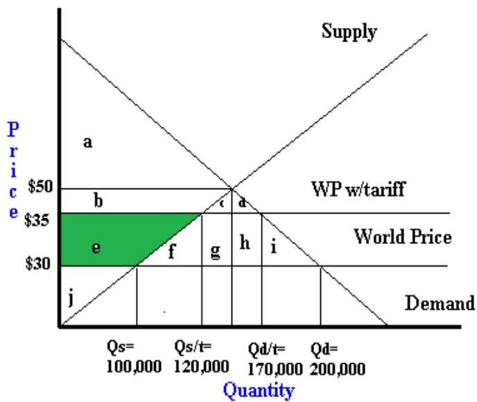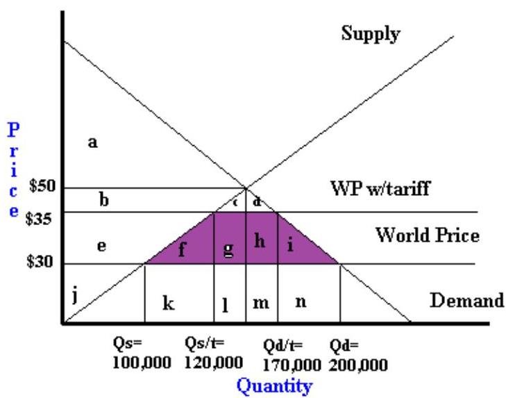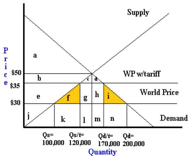 Deadweight loss after tariff = f + i = ($35-$30)*(120,000-100,000)/2 +