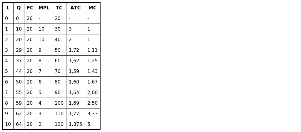 MPL = ΔQ/ΔL, TC = FC + w*L, ATC = TC/Q, MC = ΔTC/ΔQ.