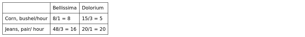So, for 1 hour, Bellissima can produce 8 bushels of corn, and in Dolorium - only 5 bushel, but in Dolorium for 1 hour can be produced 20 pair of jeans, and in Bellissima - only 16 pair of jeans.