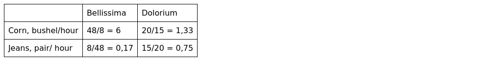 It can be seen that the alternative corn costs are lower for Dolorium (1,33 less than 6), and for jeans is lower for Bellissima (0.17 lower than 0,75). It means that Dolorium has a comparative advantage in corn, and Bellissima - in jeans.