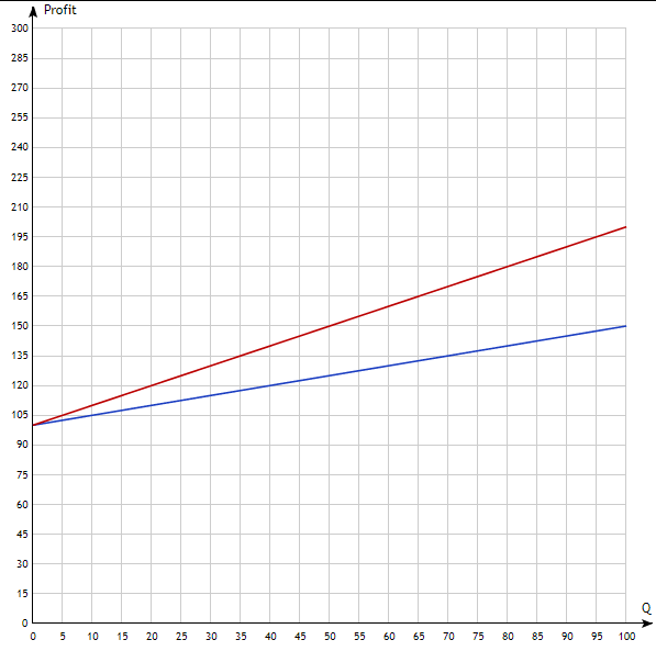 a.In the graph below, the abscissa shows the amount of goods sold, and the ordinate shows profit. The total profit is shown in blue, and the manager's profit is shown in red.