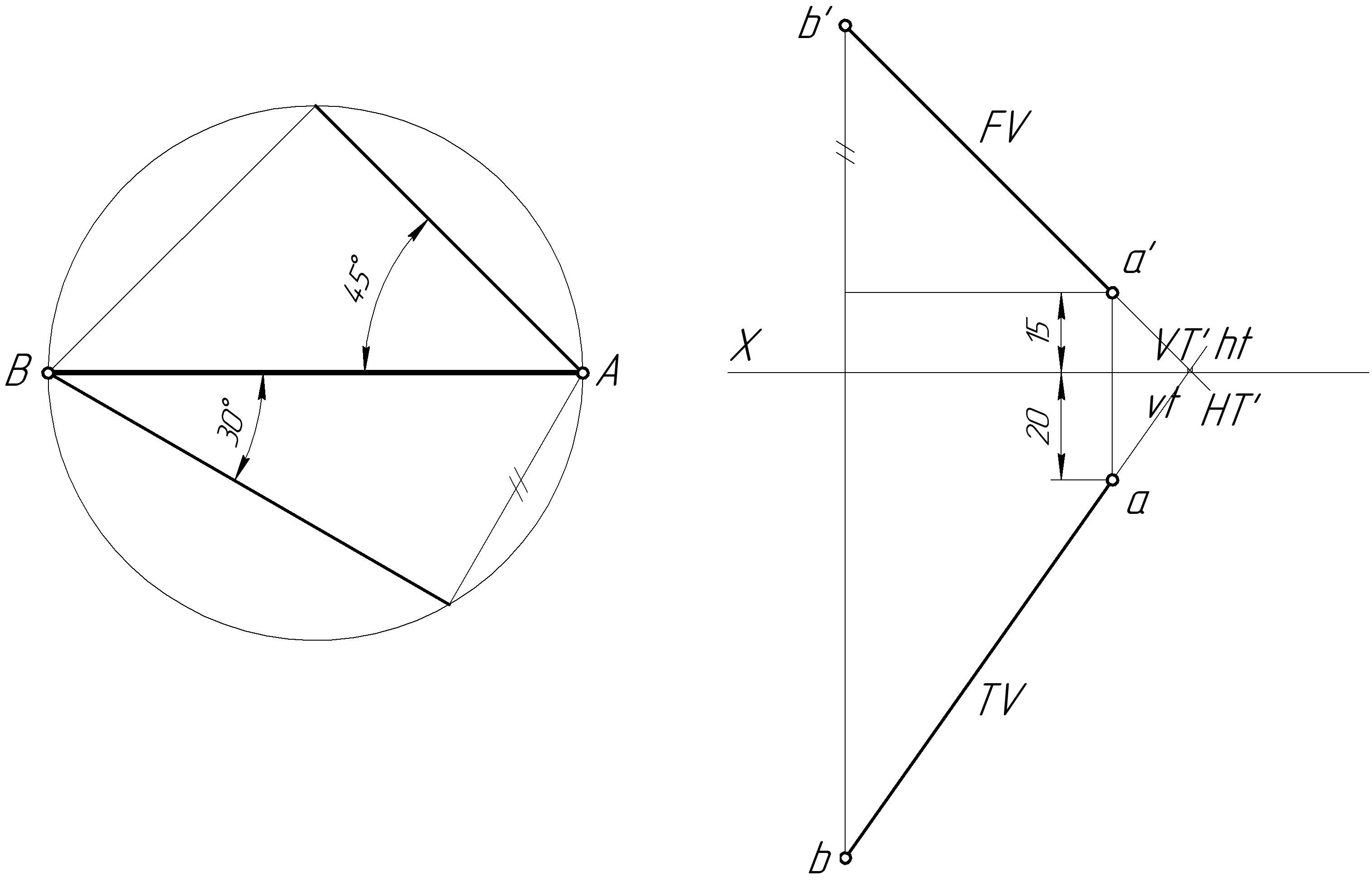 HP and 20 in front of VP. Draw its projections and locate its traces.