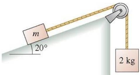 Figure shows a block of mass m resting on a 20∘ slope. The block has coefficients of friction μs=0.81 and μk=0.45 with the surface. It is connected via a massless string over a massless, frictionless pulley to a hanging block of mass m2=2.0kg.