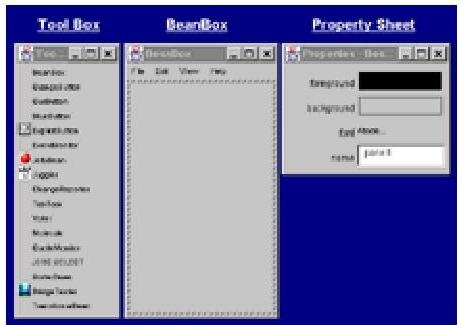 - On the right, the Property Sheet. This window contains property editors for all of the properties of the currently selected bean. (In Figure 2, the currently selected bean is the BeanBox itself, as evidenced by the crosshatched box around the perimeter of the BeanBox.)