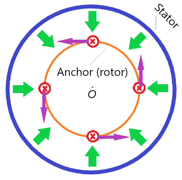 According to Ampere's law, the magnetic field (green) acts on the wires with current (red) and produces Ampere's force (purple). The magnetic field and is produced by the DC current flowing in the coils installed in the stator. The currents in wires of the rotor can be produced by the same voltage source.