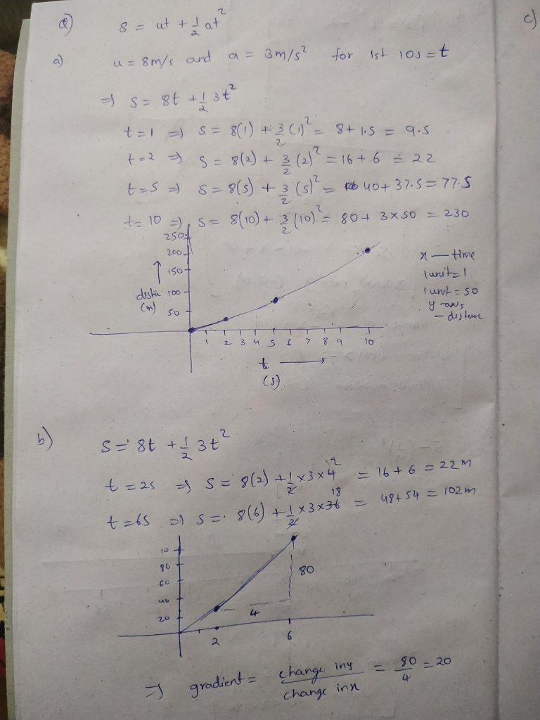 1- The equation for a distance, s(m), travelled in time t(s) by an object starting with an initial velocity u(ms-1) and uniform acceleration a(ms-2) is: 𝑠=𝑢𝑡+12𝑎𝑡2 𝑒𝑞(1) The tasks are to: a) Plot a graph of distance (s) vs time (t) for the first 10s of motion if 𝑢=10𝑚𝑠−1 and 𝑎=5𝑚𝑠−2. b) Find the gradient of the graph at 𝑡=2𝑠 and 𝑡=6𝑠. c) Differentiate the equation to find the functions for i) Velocity (𝑣=𝑑𝑠𝑑𝑡) ii) Acceleration (𝑎=𝑑𝑣𝑑𝑡=𝑑2𝑠𝑑𝑡2)