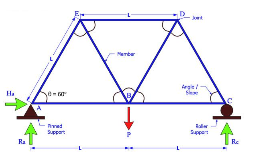 In Graphical method of truss analysis, In this analysis structure has many bars and points which connected at their end to form stable framework. And after that we apply loads and reactions that are applied to truss only on joints.