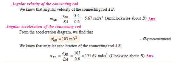 The crank and connecting rod of a reciprocating engine are 150 mm and 600 mm respectively. The crank makes an angle of 60° with the inner dead center and revolves at a uniform speed of 300 r.p.m. Find, by Klein’s construction,