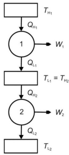 The figure below shows two engines where the heat sink of engine 1 is the heat source of engine 2. In fact, the two reversible heat engines taken together are fully equivalent to one single reversible heat engine that accepts heat transfer QH1 at temperature TH1 and rejects heat transfer QL2 at temperature TL2 while providing a net work output of W1+W2.