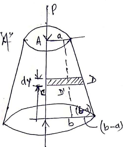 hb−a=h−yDD1DD1=h(b−a)(h−y)∴Ay=π[a+h(b−a)(h−y)]2Ay=π(b+h(a−b)y)2vy=δ=∫0hπE(b+h(a−b)y)2ρdyvA=(a−b)h⋅πEp[[b+h(a−b)y]0−1]=πE(a−b)ρh[−a1+b1]=πE(a−b)ρh[ab−b+a]VA=πEabρh