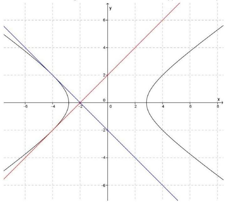 Hence there are two tangent lines x+y+2=0 (blue line) and x−y+2=0 (red line). There are two tangent lines because the hyperbola is symmetric with respect to x -axis.