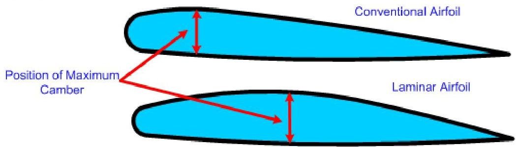 Two types of airfoils commonly used are the laminar and conventional airfoils; as a rule, the laminar foil is faster, but the cost is more adverse stalling characteristics. The two types differ with respect to location of the maximum camber—while the maximum camber on a conventional airfoil is located behind the leading edge, the laminar maximum camber is located at chord.