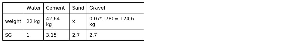 Find the quantities by weight and volume required to prepare 1m3 of a concrete mix which consist of one portland cement bag. 0.07m3 gravel and 22 liters of water. The properties if the component are as follows
