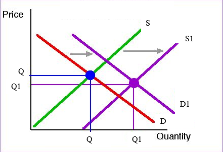 If more consumers and more business participate in the market, the supply and demand curve will moves to the right (S1 and D1). The equilibrium price decreases from P to P1 and the quantity demanded and supplied increase from Q to Q1.