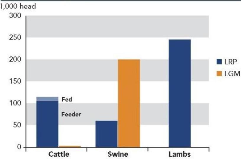 As it can be seen almost all cattle insured are under LRP, and most are feeder cattle (Figure 3). Feeder cattle are mainly forage based, so the primary market risk is price. While more head of swine and lamb are covered than cattle, their premium has been about half that for cattle. For swine, LGM is much more popular than LRP, as producers like the ability to hedge against feed price changes.