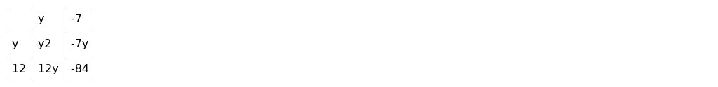 We can always check our factoring by multiplying the terms back out to make sure we get the original polynomial. Here is the form of a quadratic trinomial with argument y[(y2−5y−84)] . To solve this problem we multiplying a and c ( a=1,c=−84 ). We get (1)(-84) = -84