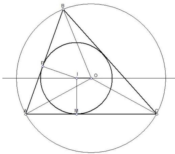 and by the tangent law we obtain that sin2Asin(2A−∠IOA)=tan(2A−2C). Thus, IO=R∣∣tan(2A−C)∣∣.